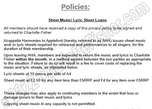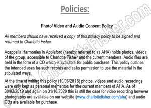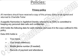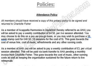 To help answer any questions you may have about membership within Acappella Harmonies in Appleford, please take a look at our policies below. Click images to enlarge.